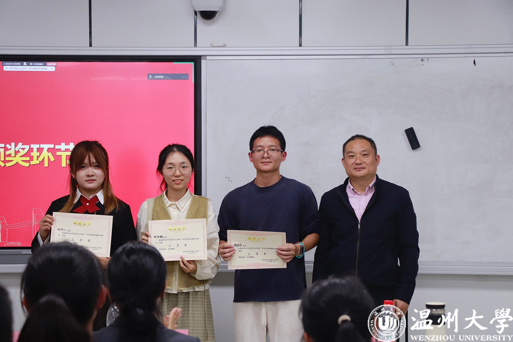 在颁奖环节,三位评委老师依次为获胜选手们颁发奖状,并与之合影留念,共同见证这一殊荣时刻。