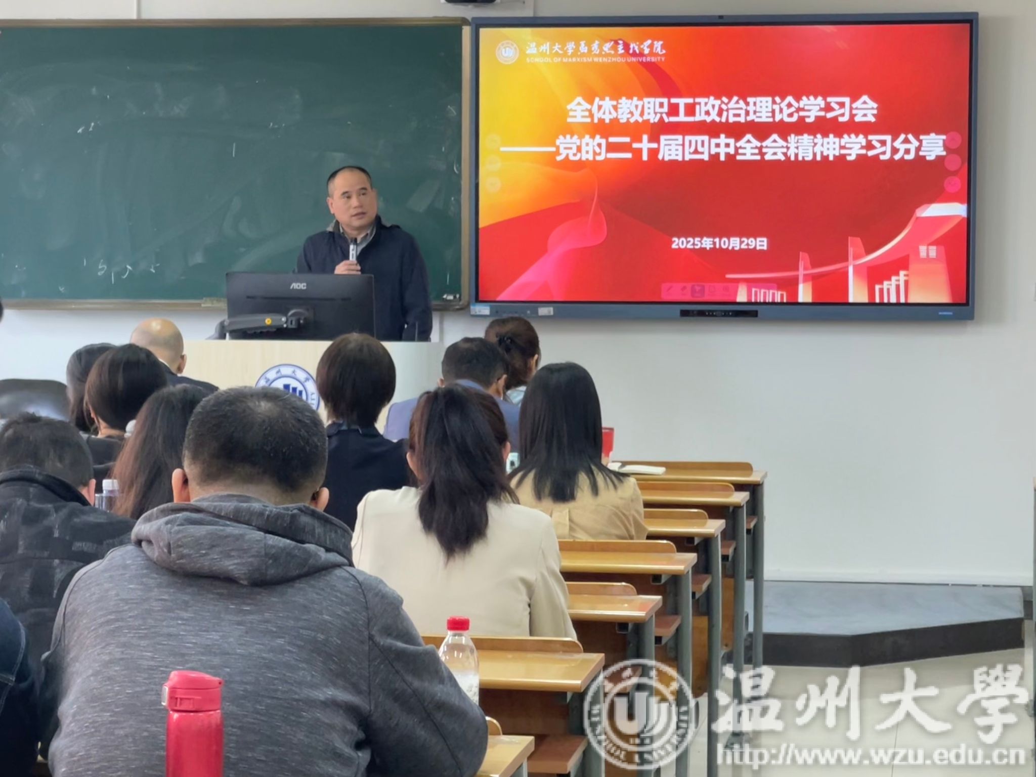 2025年10月29日下午,马克思主义学院在北校区4号楼306教室召开全体教职工政治理论学习会,专题学习党的二十届四中全会精神。学院领导班子成员、全体教职工参加会议,学院党委书记杨立淮主持会议。