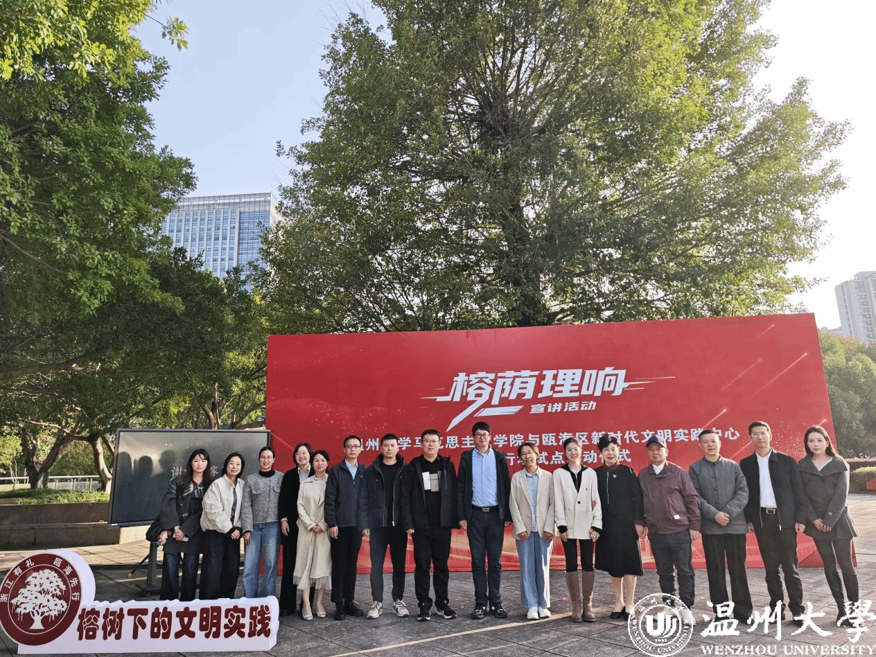 11月25日下午,温州大学马克思主义学院与瓯海区新时代文明实践中心共建行动在瓯海区市民广场榕树下顺利举行。瓯海区委常委、宣传部部长胡晓立,温州市文明中心室务会成员、二级调研员蒋维纲,温州大学马克思主义学院院长卓高生、党委书记杨立淮,瓯海区委宣传部副部长、区文明中心主任李乐,温州市文明中心城市文明建设处副处长张勇,以及双方宣讲团代表共同出席。