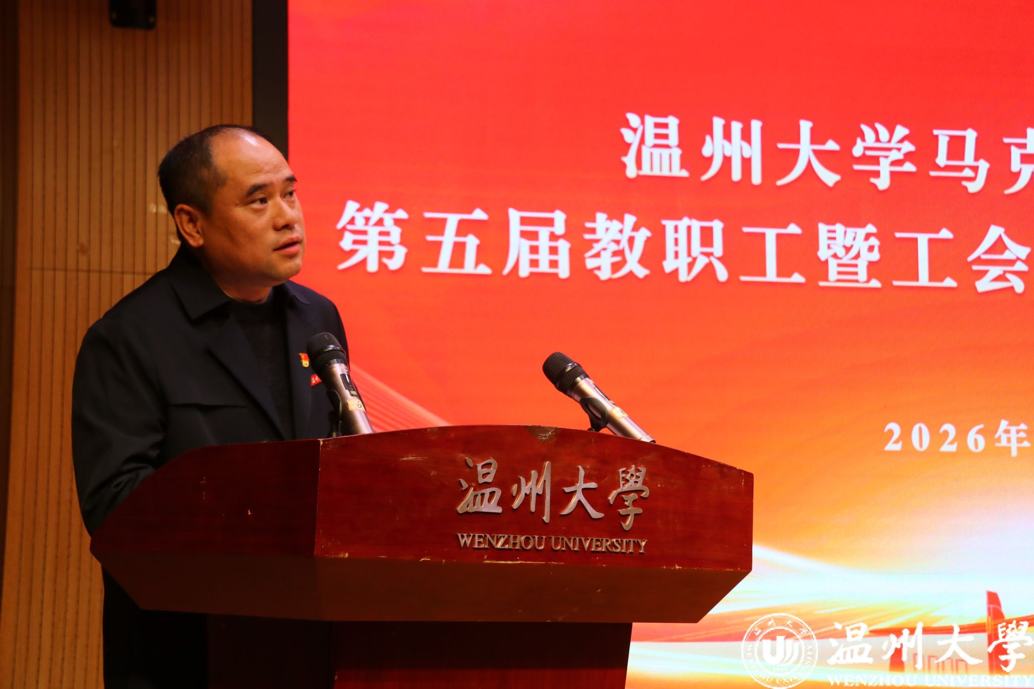 2026年1月16日下午,温州大学马克思主义学院第五届教职工暨工会会员大会第一次会议在北校区4号楼音乐厅召开。校工会专职副主席孙安梭莅临指导,学院党委书记杨立淮主持会议,全体教职工和工会会员齐聚一堂,共商学院发展大计,共绘未来奋进蓝图。