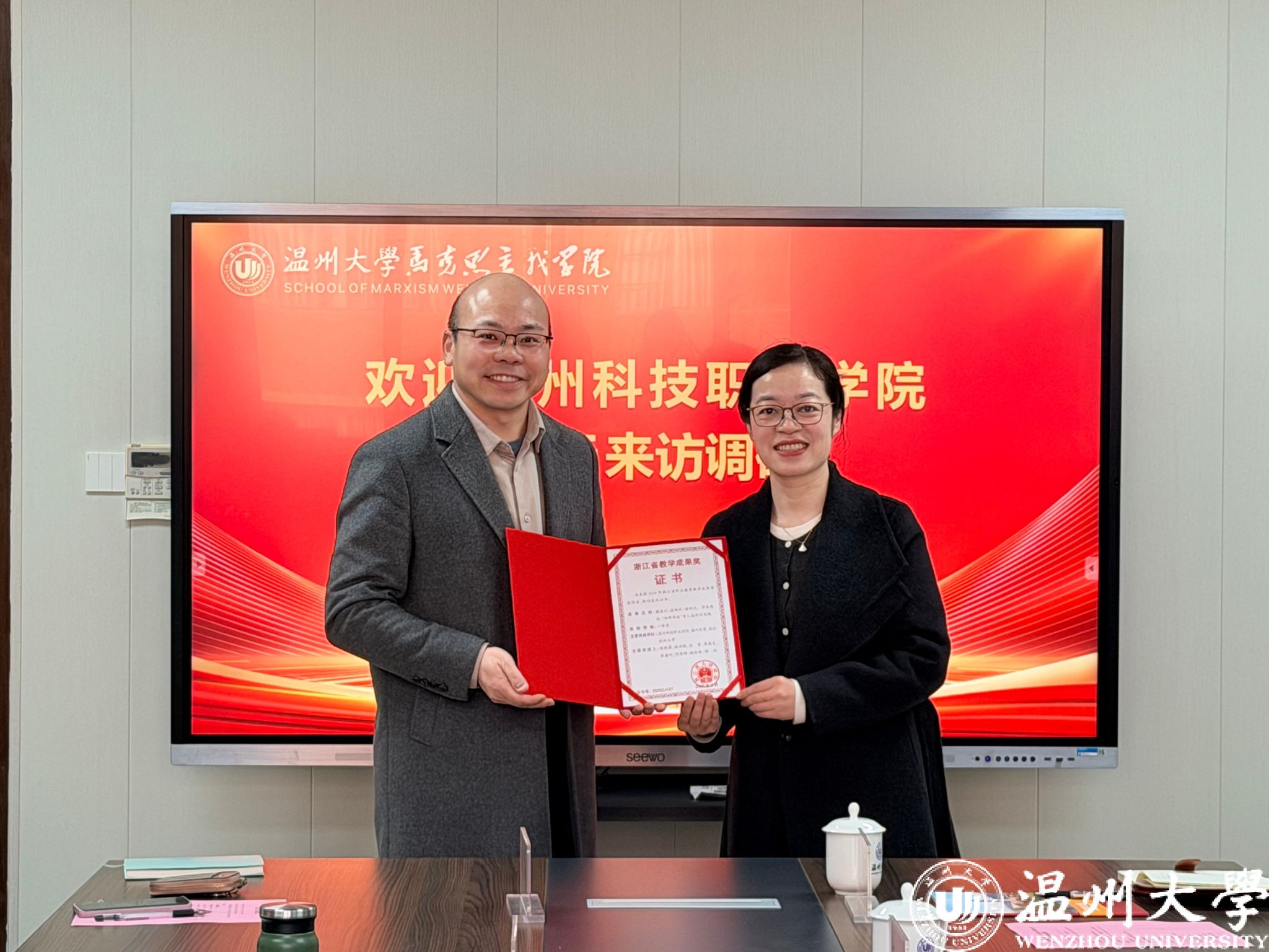 参观结束后,双方围绕马院建设核心议题开展座谈交流。座谈会上,双方聚焦马院“十五五”发展规划、教学改革创新、人文社科研究、大思政课建设、大中小思政课一体化、社会服务等重点工作,深入分享经验、坦诚交流思路、共谋破题举措,在思政教育提质增效、学科内涵发展、校地协同服务等方面达成诸多共识。温科院马克思主义学院与温大马院等单位合作,获得2025年省职业教育教学成果一等奖,双方强调要继续深化合作,共同推进教育教学改革创新。