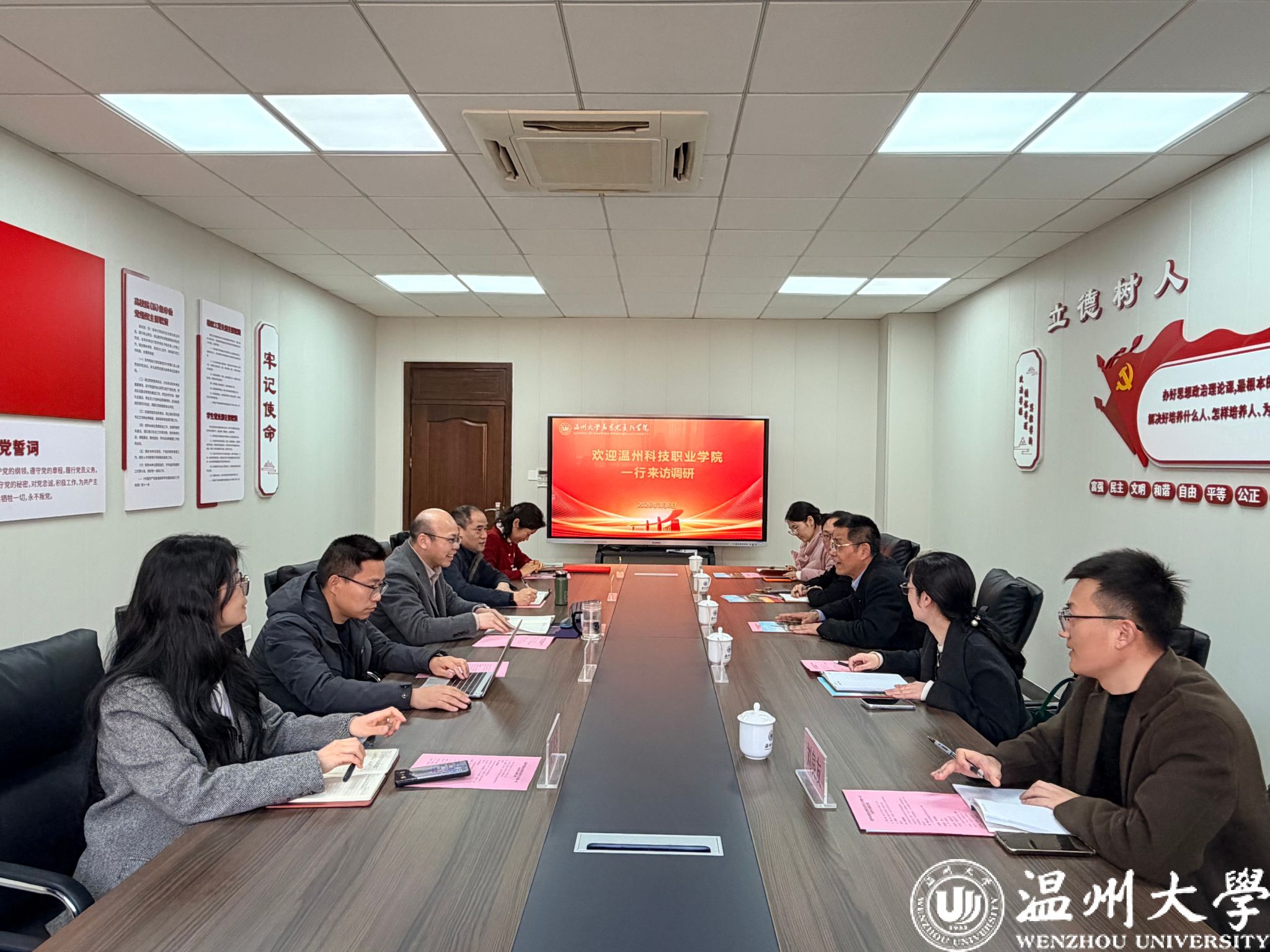为深化校际合作、共商思政育人高质量发展路径,2026年3月6日下午,温州科技职业学院马克思主义学院特聘教授施端银、院长陈晓莉一行5人前往温州大学马克思主义学院开展学习调研。杨立淮书记主持交流活动,学院班子成员参加座谈会。